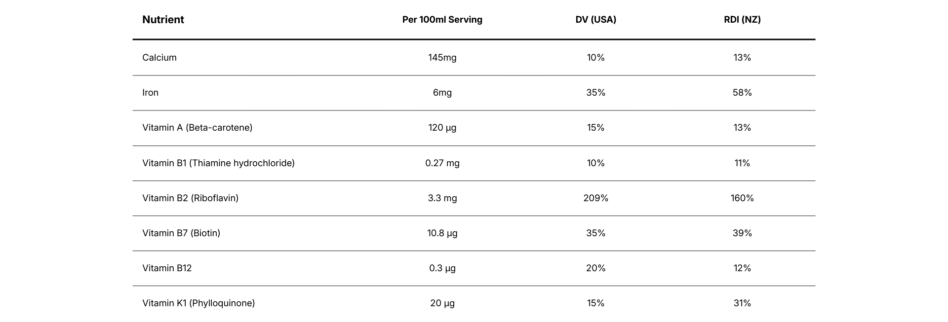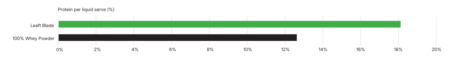 Each 100 ml serve packs the equivalent of 50,000+ green leaves This density matters because it lets you get more from less. More usable protein per liquid serve, without bulk.